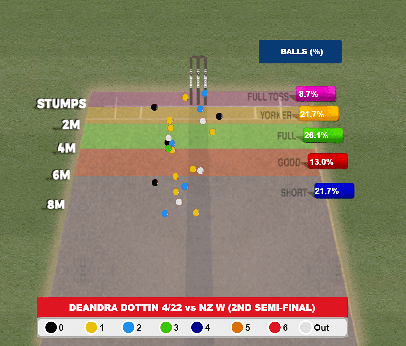 In her next over (17th of the innings), Dottin got two wickets — Maddy Green and Rosemary Mair, both of whom were deceived by slow deliveries on the stump line. This clever mixture of yorkers, short deliveries and slower cutters proved beneficial for the Windies at the end.