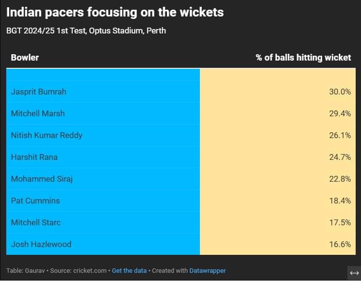In fact, not only Bumrah but even Harshit Rana, Mohammed Siraj and Nitish Reddy hit the stumps more than every single Australian bowler except Mitch Marsh, who looked quite threatening until Reddy and Virat Kohli swatted him away.