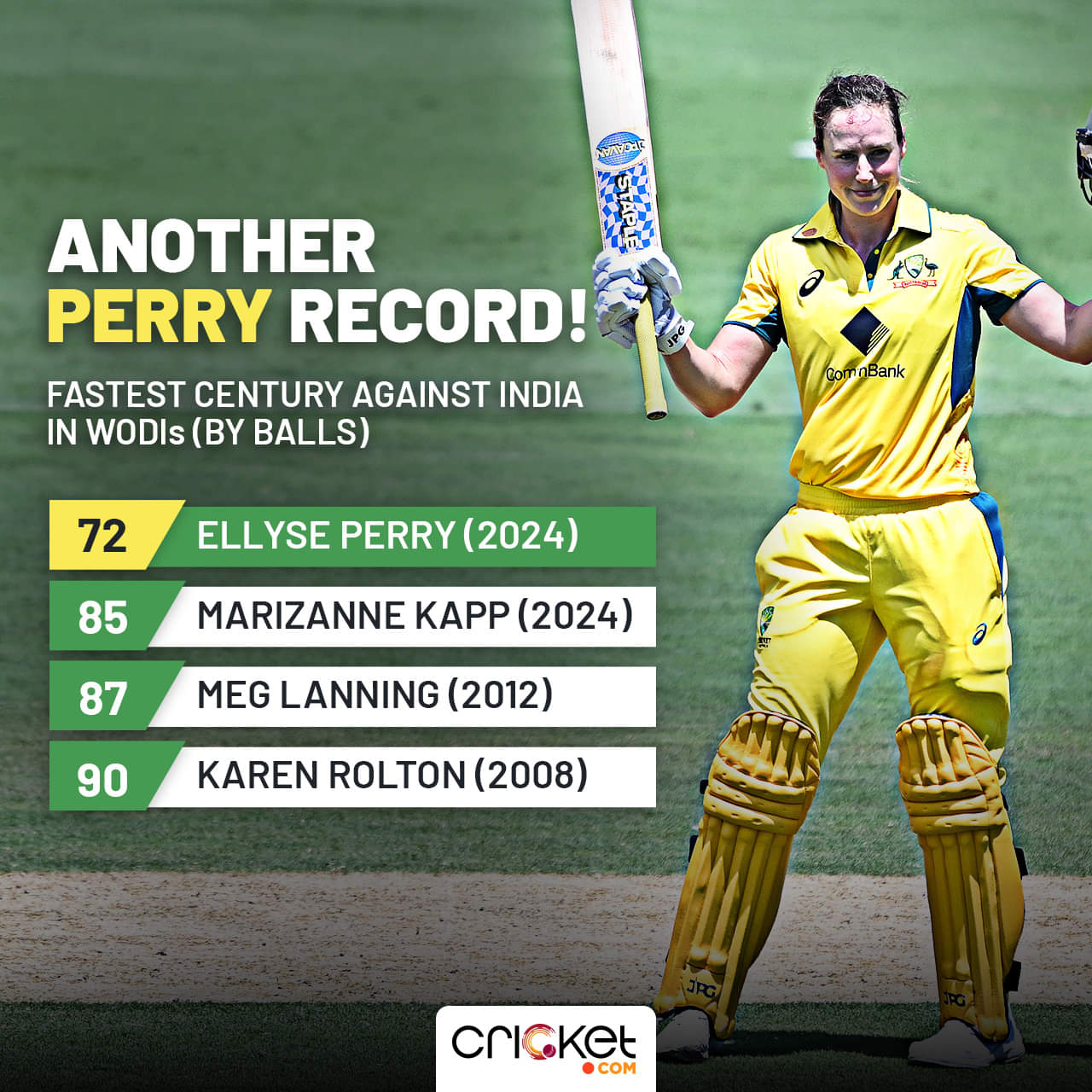 She targeted the Indian spinners Deepti Sharma, Minnu Mani, and Priya Mishra, scoring 87 runs in just 53 deliveries against them. She slog-swept and hit them straight in the V often, as she used her feet to great effect in the game — something Indian batters still failed to do except Jemimah Rodrigues in the second ODI. In the process, Perry brought up her century in just 72 deliveries, the fastest against India in ODI history.