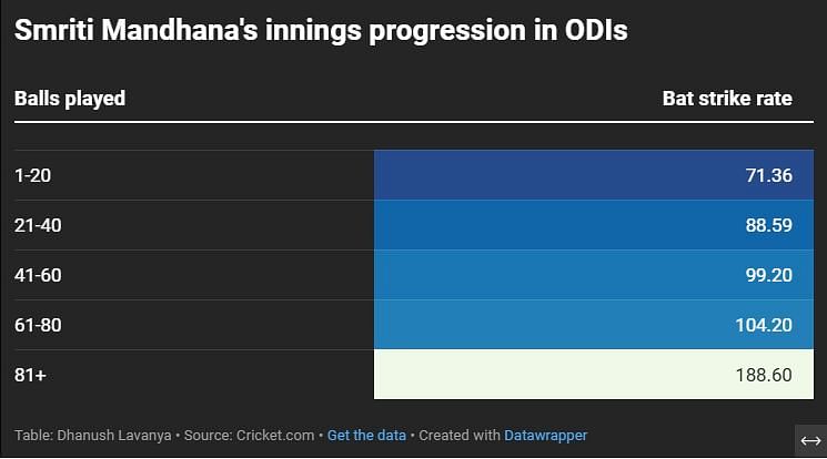 While Mandhana was superb in ODI cricket between 2018 and 2023, averaging 51.81 with a strike rate of 86.42, her T20I numbers in her almost decade-long career until then were mediocre at best for a batter of her repute and skills.