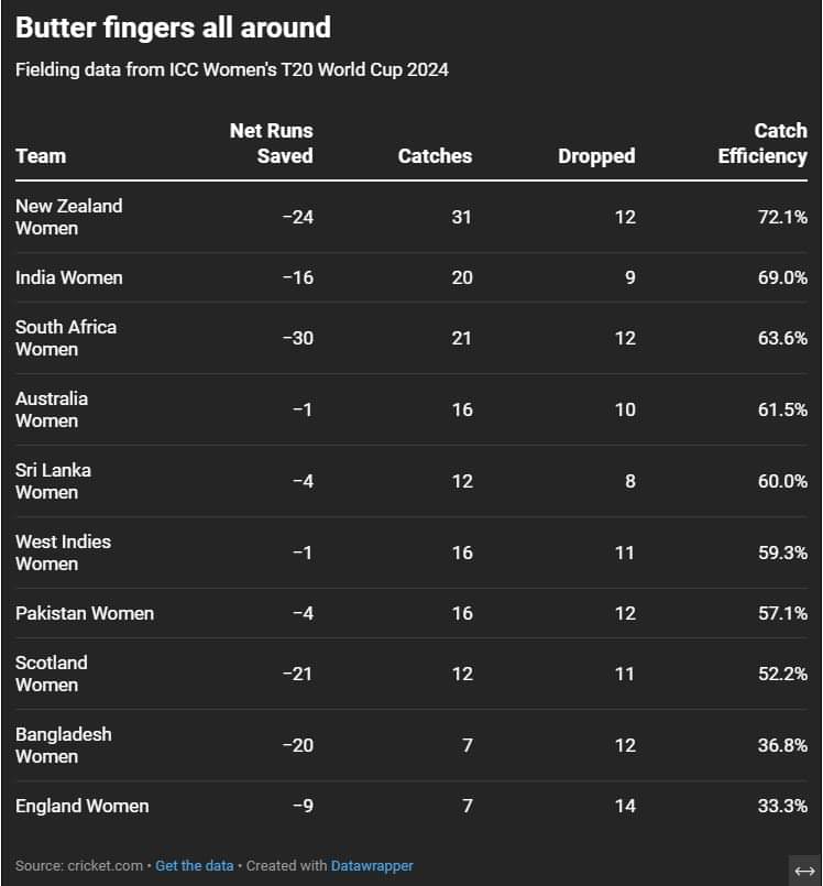 111 drop catches in 23 games. That’s almost five drops every single game! That’s how bad the fielding efforts were in this World Cup. Even the Australian women, arguably the best fielding side overall, dropped two catches every game on average this tournament.