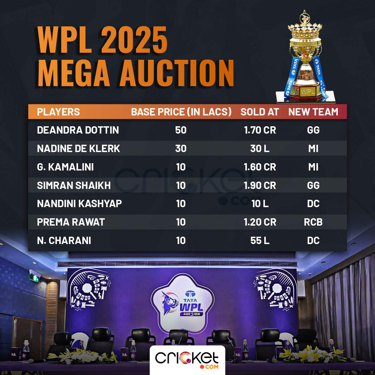 Players bought: G Kamalini (1.6 crore), Nadine de Klerk (30 Lakh), Akshita Maheshwari (20 Lakh), Sanskriti Gupta (10 Lakh)