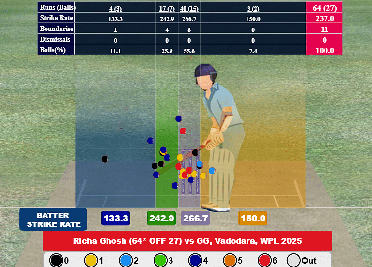 A hat-trick of fours followed those two deliveries as 23 runs came in that over. What stood out in those boundaries were the smarts Ghosh showed as she gently guided the wide but full deliveries from Gardner for four towards the third-man region, which were meant to entice her to play a loose slog. That’s why she had a strike rate of 242.9 on deliveries that were bowled on the fourth to sixth stump line.